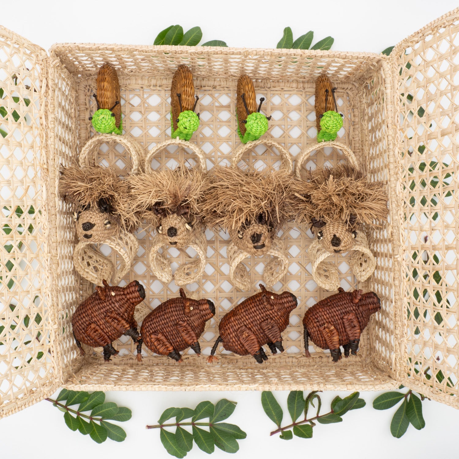 Laissez-vous séduire par cette superbe collection de 12 ronds de serviette en palma de iraca, façonnés entièrement à la main par des artisans colombiens. Chaque rond est le fruit d’un savoir-faire traditionnel transmis de génération en génération, garantissant des pièces uniques et une rémunération équitable pour ceux qui les créent. Voici un exemple parfait où deux cultures se rencontrent.