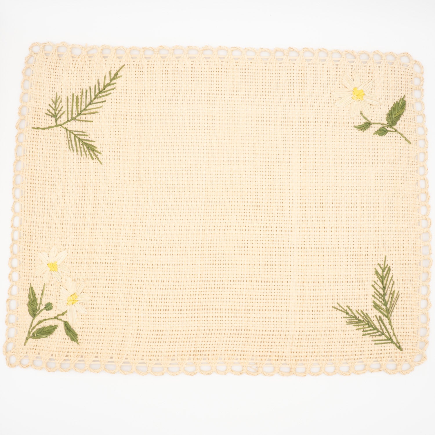 Sublimez votre table avec ces sets de table artisanaux mettant en avant la délicate fleur d'Edelweiss. Brodés à la main sur une fibre naturelle, ils se déclinent en trois teintes de paille pour s'adapter à votre décoration.